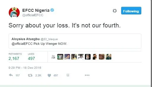 When a twitter user, Aloysius Atuegbu @El_blaque asked the Commission to “Pick Up Wenger NOW” for the defeat, the handler in the Sarcasm way responded with “Sorry about your loss. It's not our fourth”.